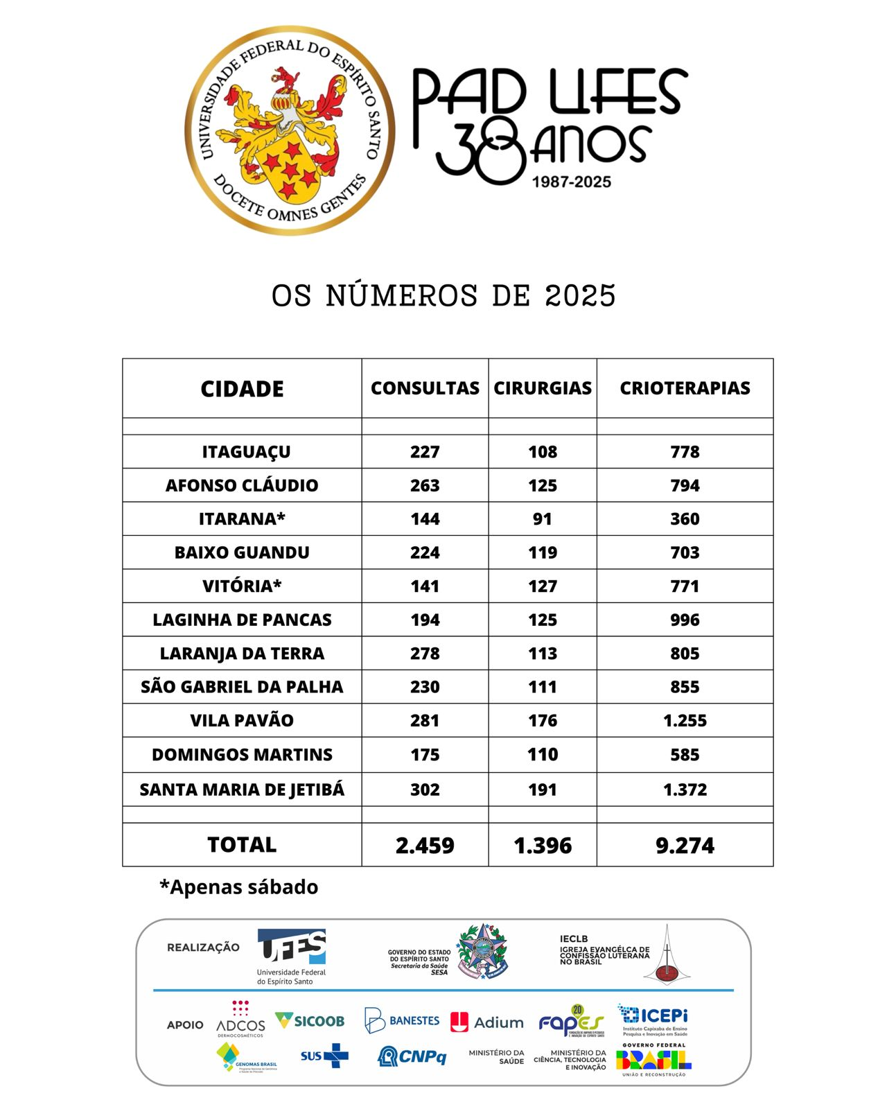 As viagens do Programa de Assistência Dermatológica e Cirúrgica (PAD-UFES) ao interior do Espírito Santo têm desempenhado um papel fundamental na ampliação do acesso à saúde especializada e na detecção precoce do câncer de pele em regiões historicamente mais vulneráveis no estado do Espírito Santo. Ao longo dos mutirões realizados em municípios do interior capixaba, milhares de atendimentos foram registrados, evidenciando a alta demanda por assistência dermatológica em localidades com forte presença de descendentes de imigrantes europeus, população que apresenta maior predisposição ao desenvolvimento da doença.